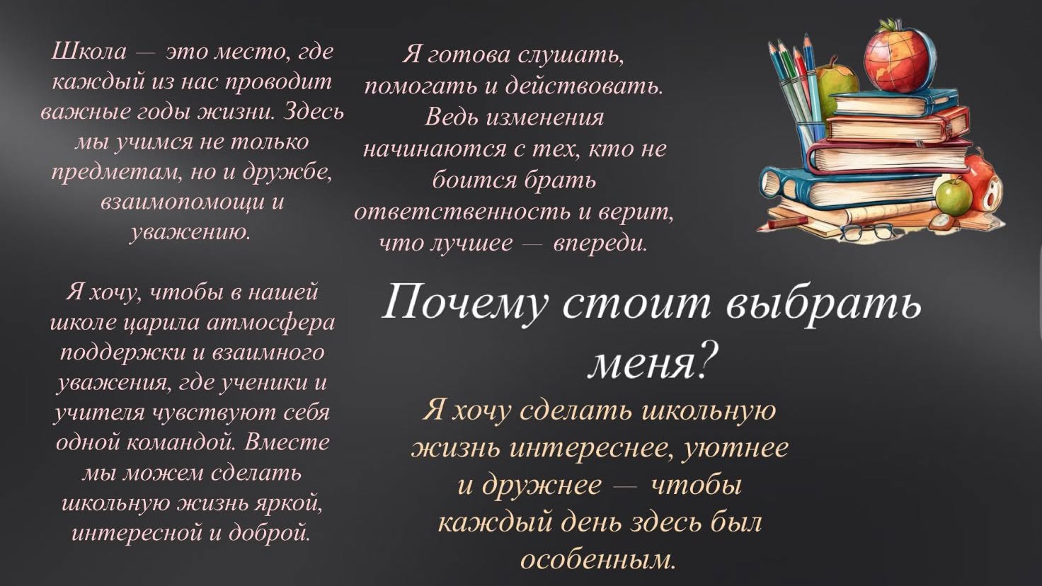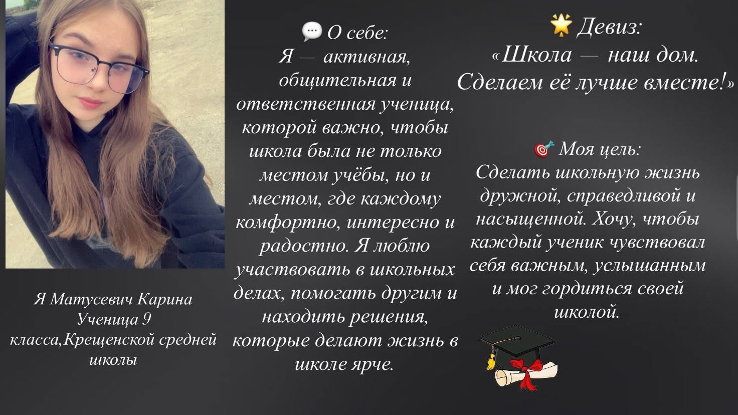 Мектеп президенттігіне Кандидат МАТУСЕВИЧ КАРИНА, 9 сынып оқушысы.