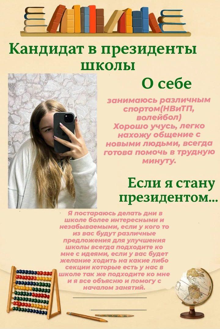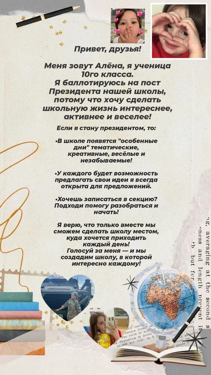 Мектеп президенттігіне Кандидат ПОНОМАРЕНКО АЛЕНА, 10 сынып оқушысы.