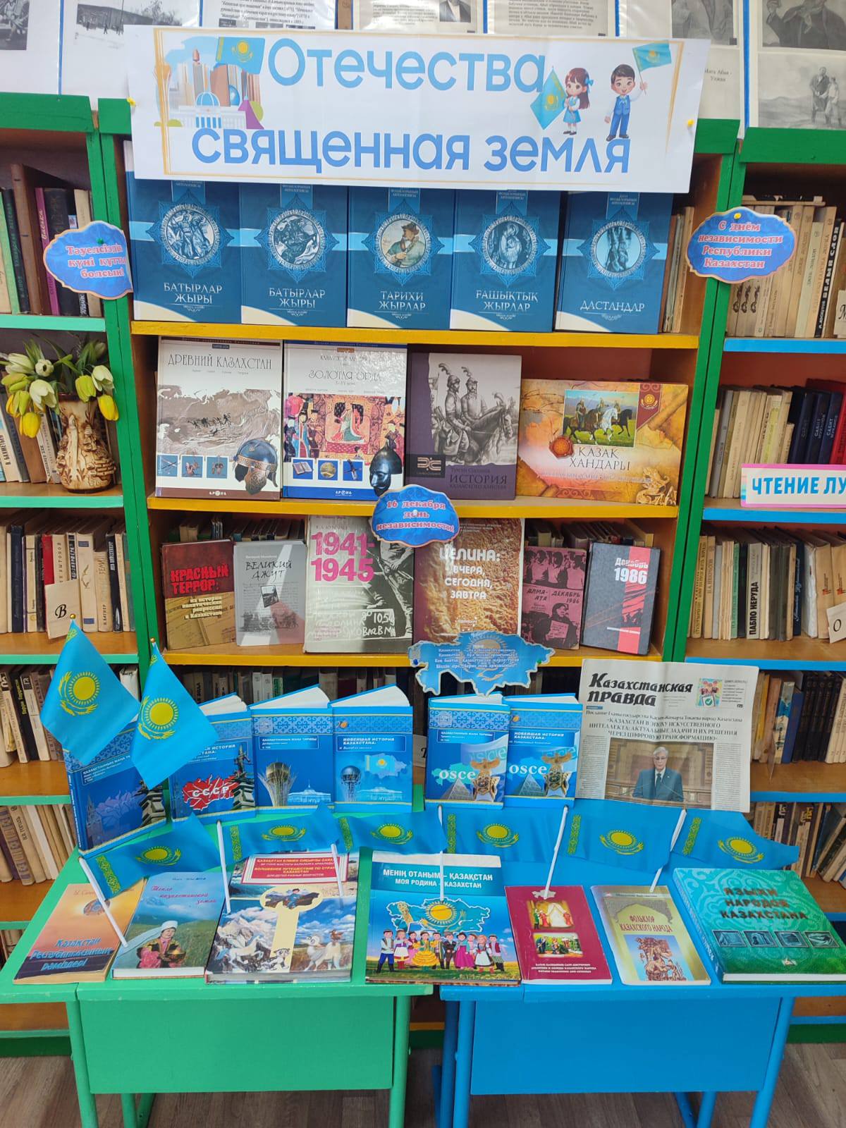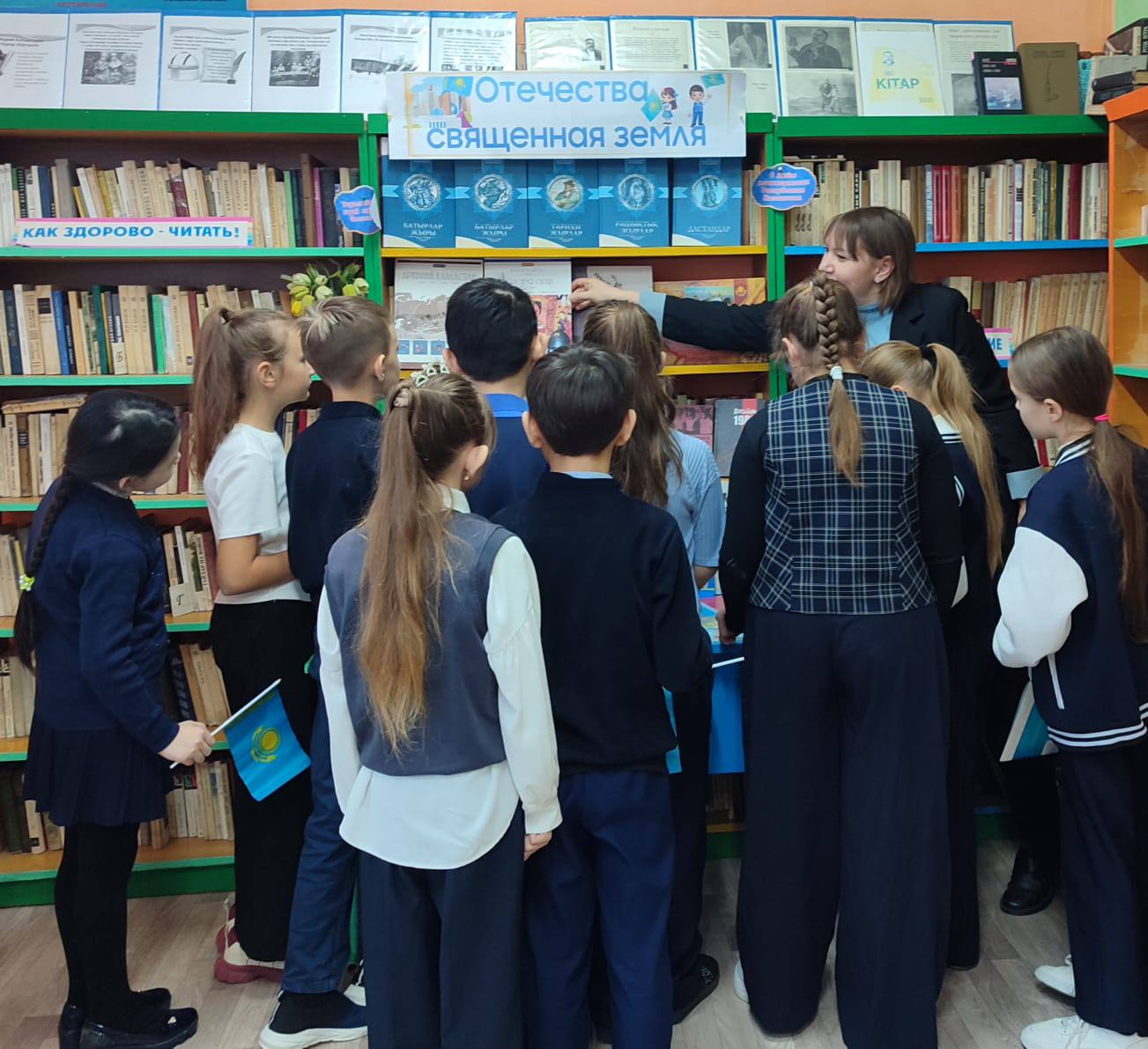Қазақстан Республикасының Тәуелсіздік күнін мерекелеу аясында кітапханашы Л.А. Сюткина 3-4 сынып оқушыларына арналған "Отан қасиетті жер" атты кітап көрмесін ұйымдастырды. Мақсаты: оқушылардың бойында отансүйгіштік пен Отанға деген сүйіспеншілік сезімін қалыптастыру, Қазақстан Республикасының тарихы мен дәстүрлерін құрметтеуге тәрбиелеу, сондай-ақ туған өлкені оқуға және тануға деген қызығушылықты дамыту. Көрмеде Қазақстан Республикасының тарихы, оның тәуелсіздігі, Мемлекеттік рәміздері, мәдени мұрасы және еліміздің көрнекті тұлғалары туралы баяндайтын кітаптар ұсынылды. Кітапханашы оқушыларды басылымдардың мазмұнымен таныстырды, балалардың қабылдауы үшін қол жетімді ең қызықты және танымдық кітаптарға назар аударды. Оқушылар кітаптарды қызығушылықпен қарап, сұрақтар қойып, Отан туралы білімдерімен бөлісті.